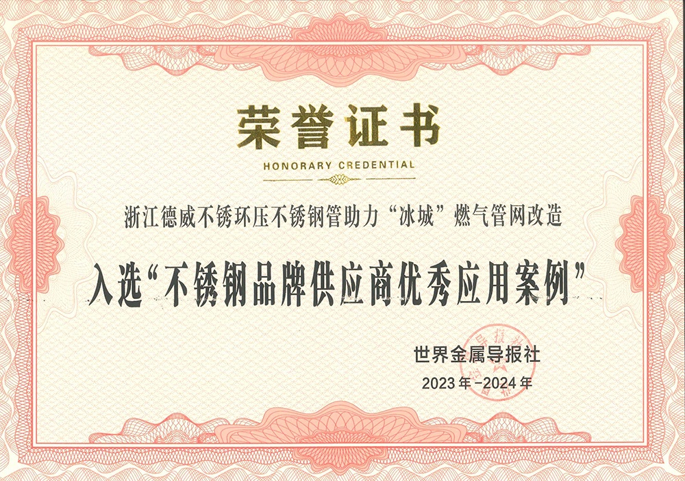 不銹鋼品牌供應(yīng)商優(yōu)秀應(yīng)用案例證書
